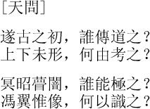 relationship, natural phenomena, historical events, and dynastic evolution. Displaying a spirit of nonconformism and skepticism, the Tian wen challenges orthodox cosmology with a fusillade of daring questions: